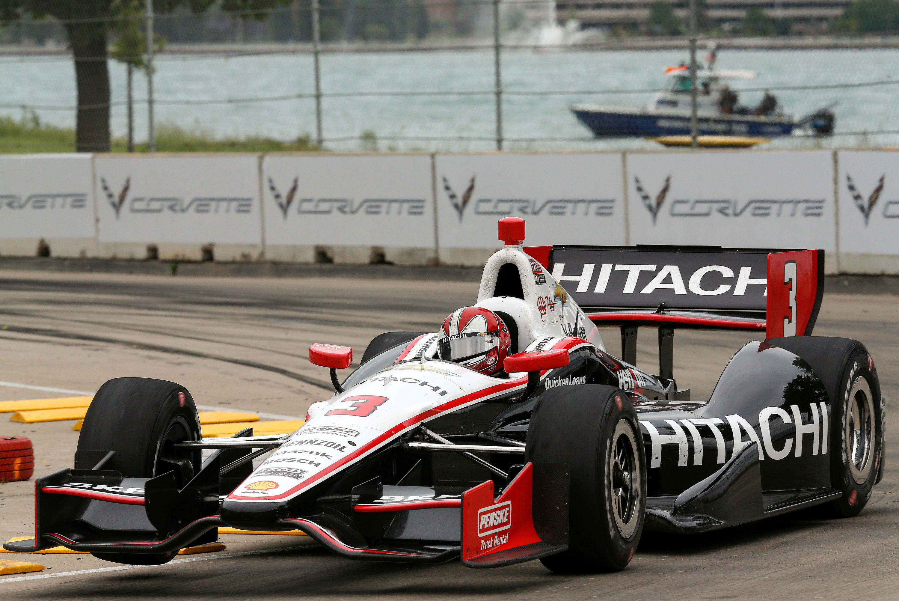 the #3 Hitachi Team Penske Chevroet IndyCar races to a